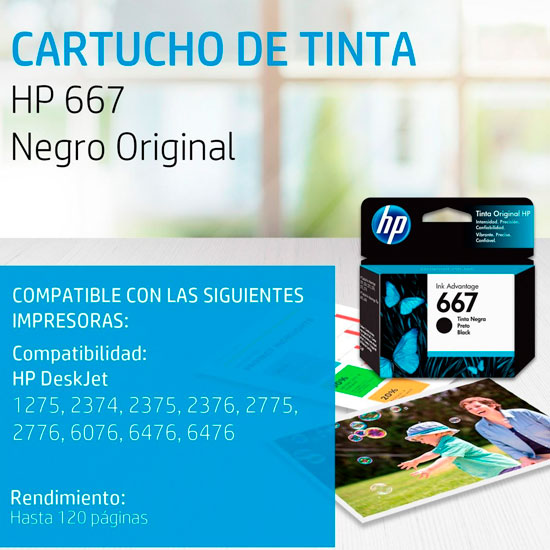 Compatible con las series DeskJet Ink Advantage 1216, 1275, 2335 – 2338, 2374 – 2376, 2775, 2776, 4175, 4176 y DeskJet Plus 6075 – 6078, 6475 – 6478, este cartucho incluye chip y holograma de autenticidad para proteger tu garantía.