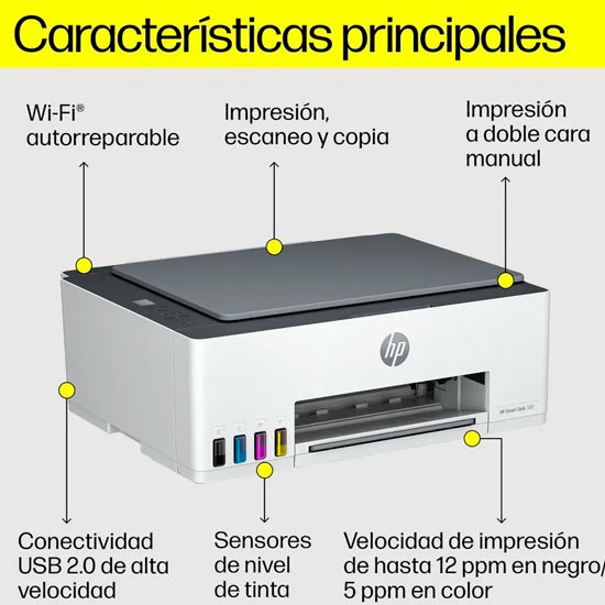 La HP Smart Tank 580 combina el bajo costo por página de los tanques de tinta con conectividad completa Wi-Fi, Wi-Fi Direct y Bluetooth. Gracias a su procesador de 980 MHz y 64 MB de RAM, imprime hasta 12 ppm negro y 5 ppm color (ISO) con resoluciones de hasta 4800 × 1200 dpi optimizados.