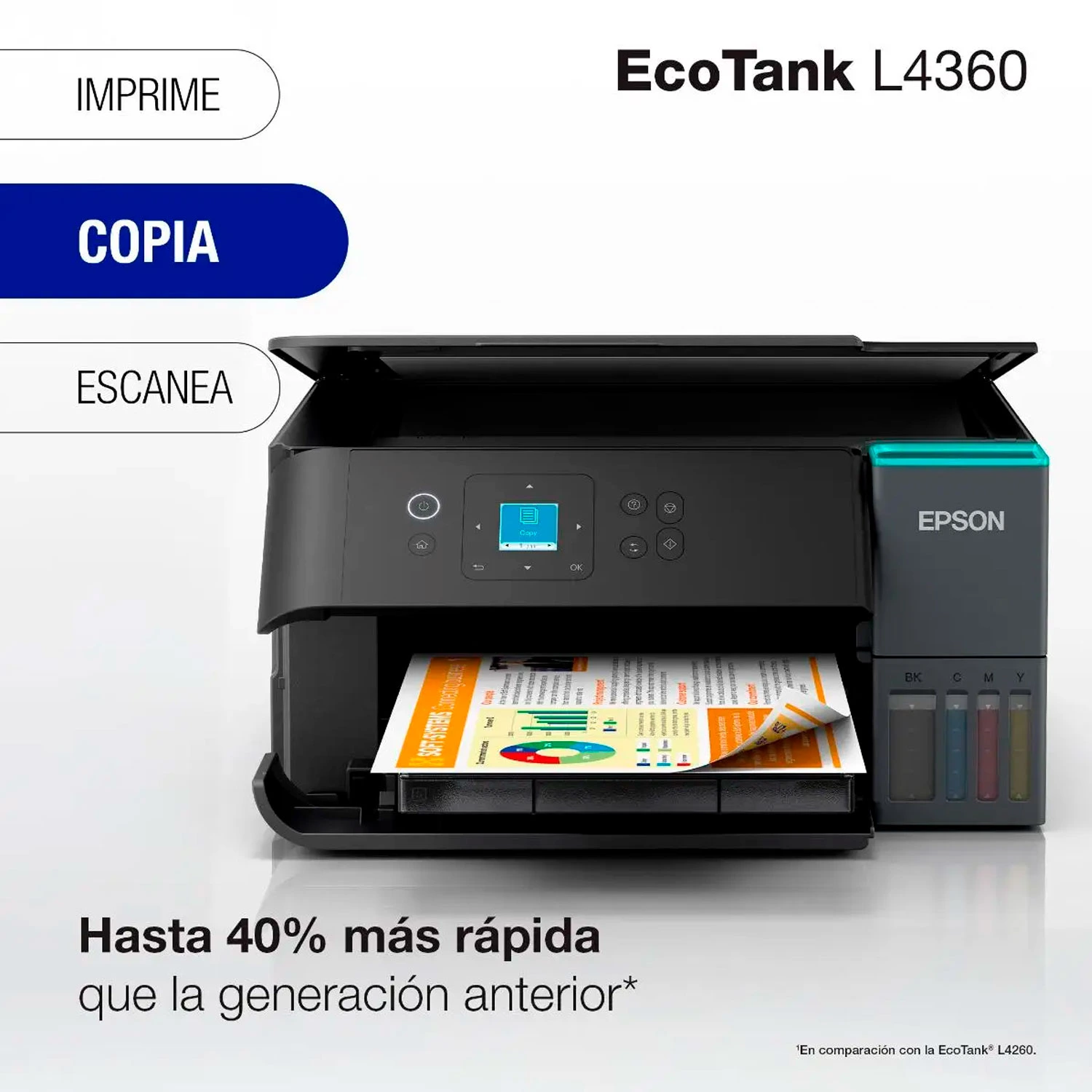 La Impresora Epson L4360 integra impresión, copia y escaneo con tanque de tinta EcoTank para bajo costo por página, dúplex automático y conectividad Wi-Fi/Wi-Fi Direct. Ideal para hogar, oficinas pequeñas, teletrabajo y estudiantes.
