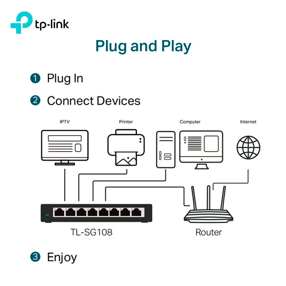 El switch TP-Link TL-SG108 es un switch no administrable de 8 puertos Gigabit (10/100/1000 Mbps) pensado para ampliar de forma rápida y confiable la red cableada en oficinas, negocios y hogares. Sus 8 puertos RJ45 con Auto-Negociación y Auto-MDI/MDIX permiten conectar PCs, impresoras, cámaras IP, decodificadores, access points y más, sin configuraciones complejas (plug and play).