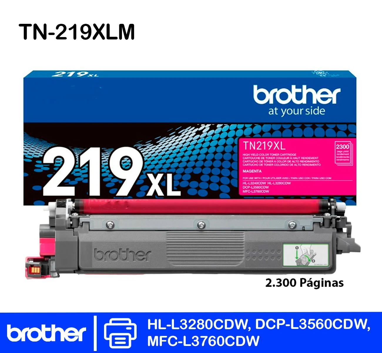 Cartucho Brother TN-219XLM magenta original para impresoras HL-L3280CDW, DCP-L3560CDW y MFC-L3760CDW. Ofrece tonos vibrantes, bordes definidos y consistencia página a página.